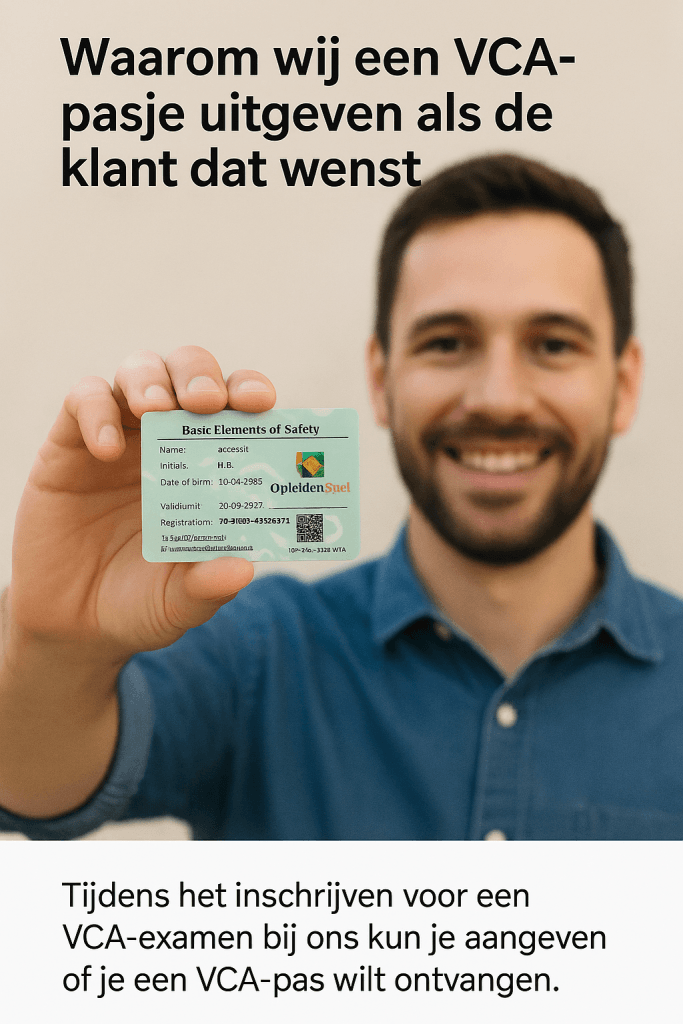 📌 Tijdens het inschrijven voor een VCA-examen bij ons kun je aangeven of je een VCA-pas wilt ontvangen. Zo bepaal je zelf of je kiest voor extra gemak op de werkvloer.